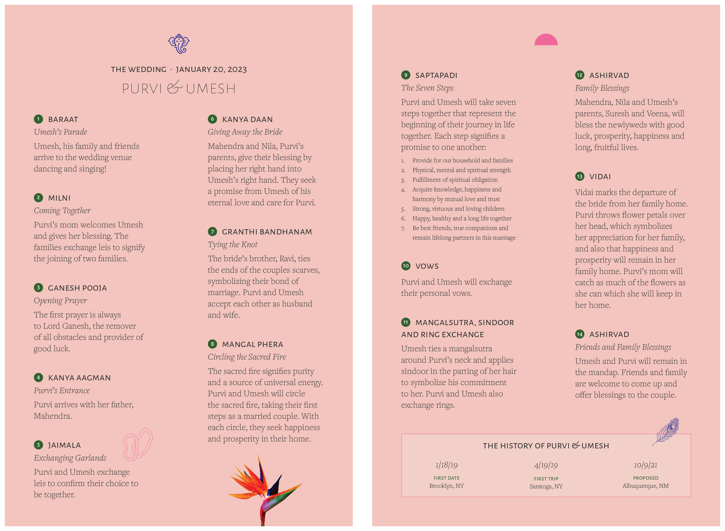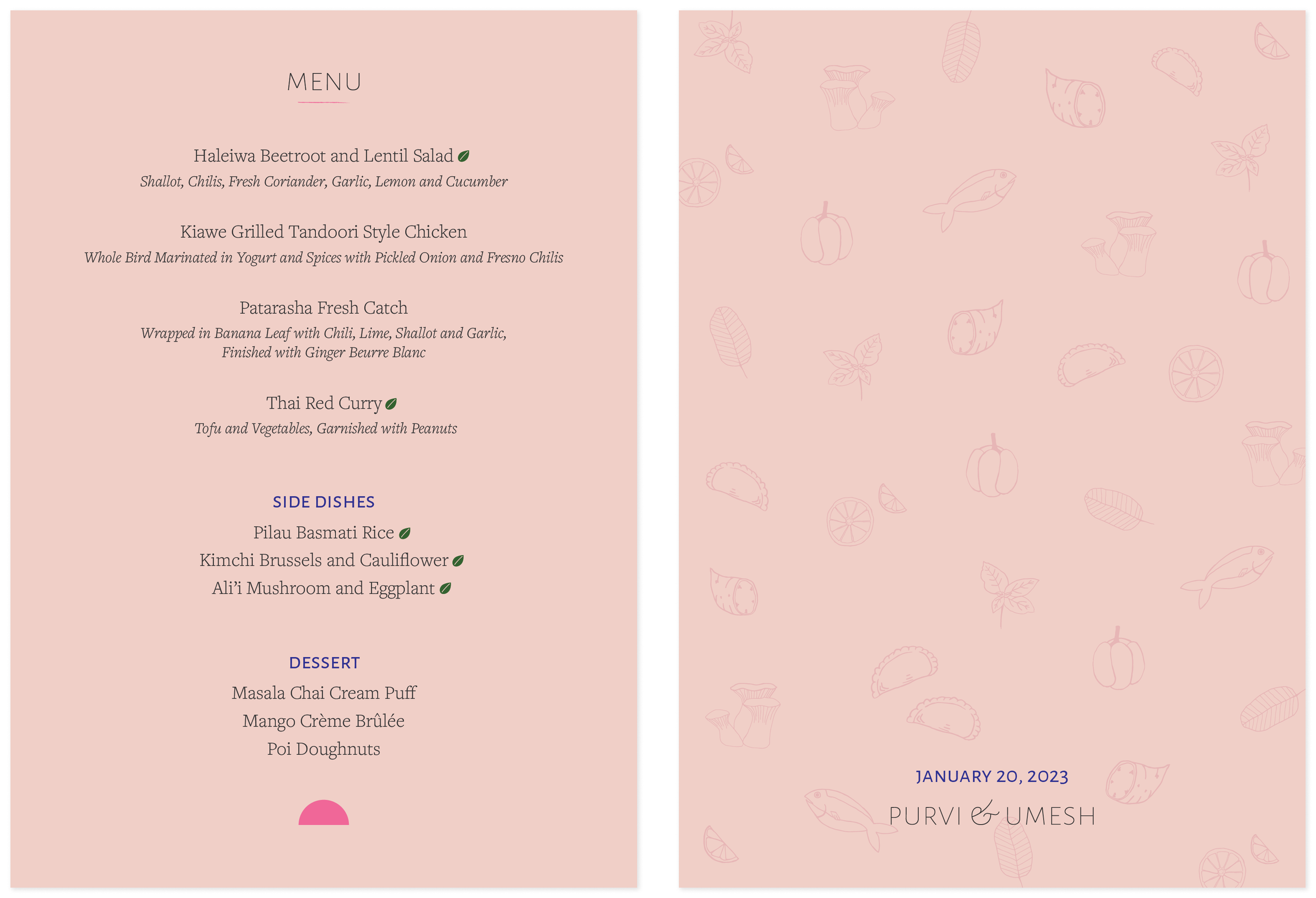 Purvi & Umesh 2022-2023Wedding stationary designs for Purvi and Umesh’s wedding in O’ahu Hawai’iSave the date Invitations Itinerary Program Menus ← All Graphic Design + Illustration